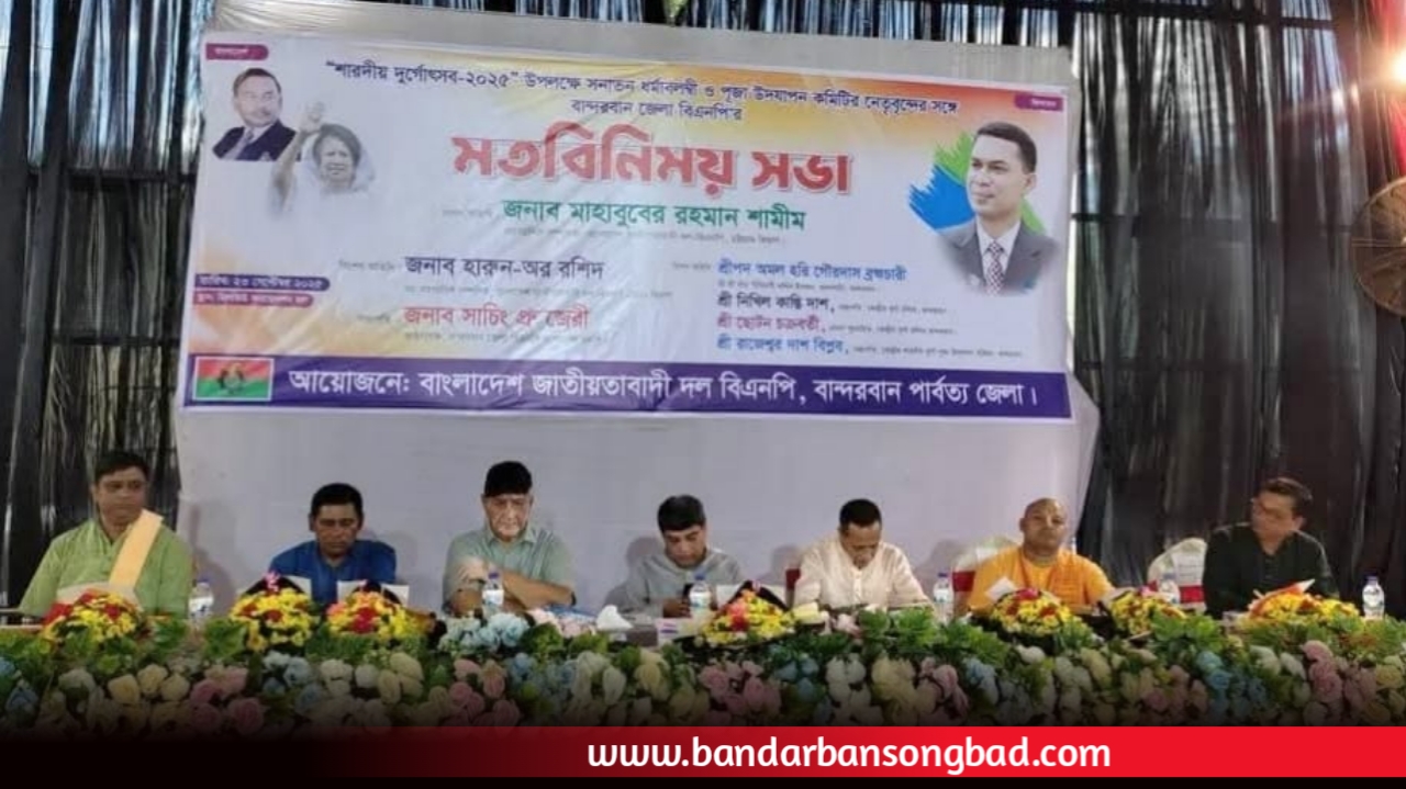 “শারদীয় দুর্গোৎসব-২০২৫ উপলক্ষে সনাতন ধর্মাবলম্বী ও পূজা উদযাপন কমিটির নেতৃবৃন্দের সঙ্গে বান্দরবান জেলা বিএনপির এক মতবিনিময় সভা ২৩শে সেপ্টেম্বর সকালে স্থানীয় হিলভিও কনভেনশন সেন্টারে অনুষ্ঠিত হয়েছে।