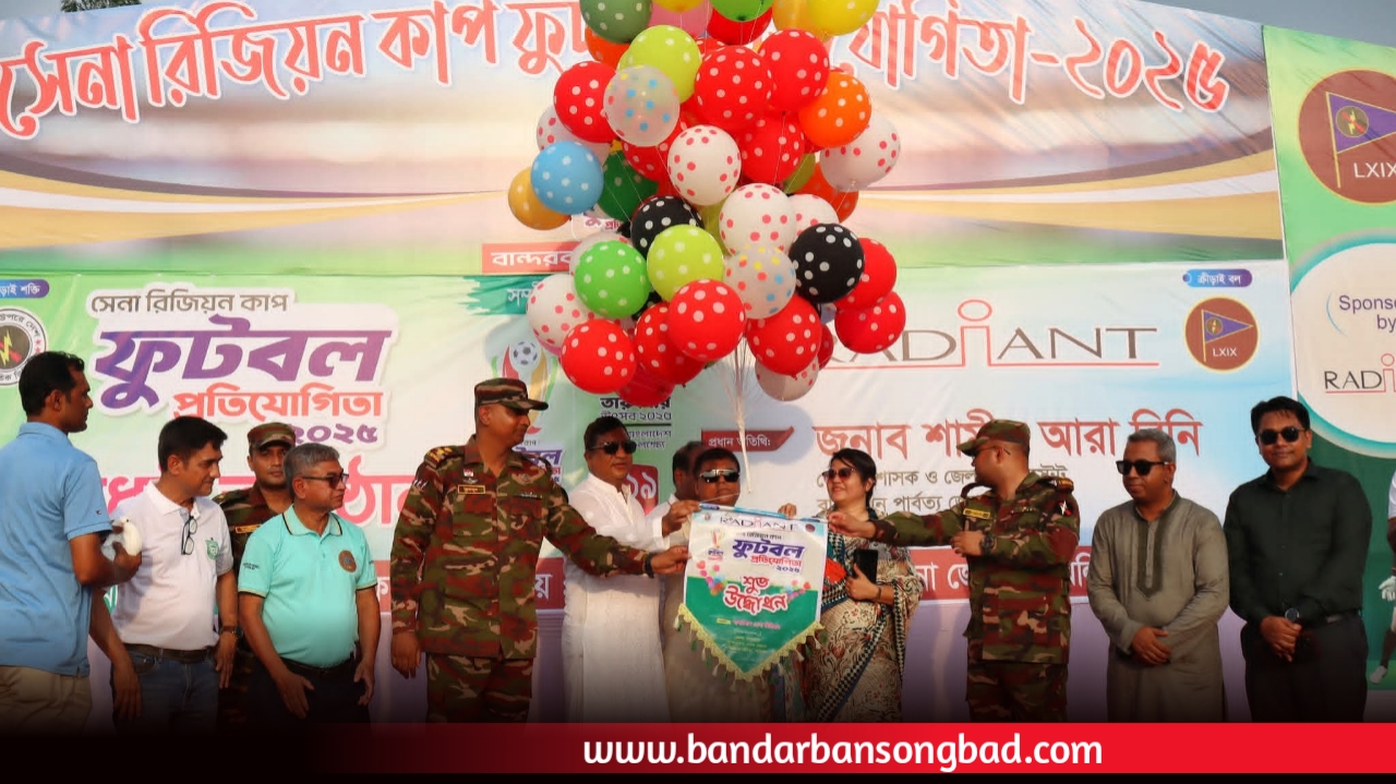 বান্দরবানে ফুটবলের বড় আসর সেনা রিজিয়ন কাপ এর শুভ উদ্বোধন হয়েছে।শুক্রবার (১৯ সেপ্টেম্বর) বিকেলে বান্দরবান জেলা স্টেডিয়ামে বান্দরবান সেনা রিজিয়ন এর আয়োজনে এবং জেলা প্রশাসন,বান্দরবান সেনা জোন ও সম্মিলিত ক্রীড়া পরিষদের সার্বিক সহযোগিতায় উদ্বোধনী অনুষ্ঠানে প্রধান অতিথি হিসেবে উপস্থিত থেকে বেলুন ও পায়রা উড়িয়ে ফুটবল প্রতিযোগিতার উদ্বোধন করেন জেলা প্রশাসক শামীম আরা রিনি।