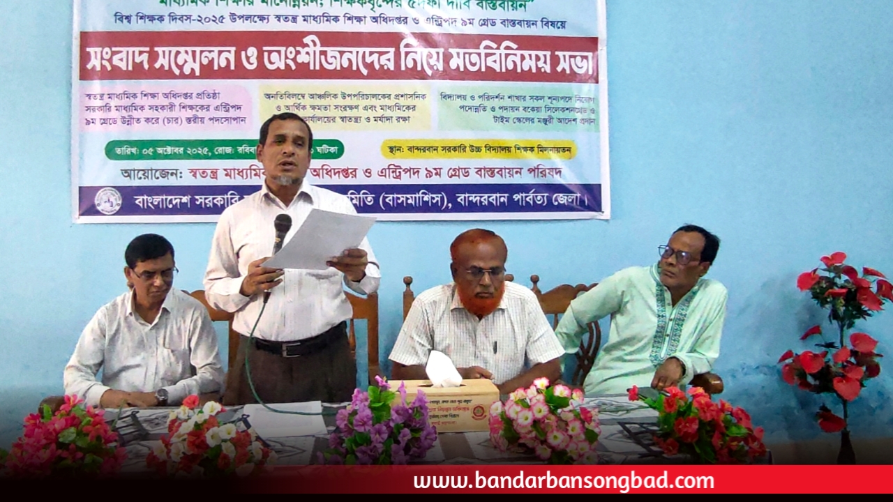 রবিবার (৫ই অক্টোবর) বিশ্ব শিক্ষক দিবসে দেশের ৬৪টি জেলার মতো বান্দরবানেও নিজেদের অধিকার আদায়,ও বাস্তবায়নের লক্ষ্যে স্বতন্ত্র মাধ্যমিক শিক্ষা অধিদপ্তর প্রতিষ্ঠা সহ ৫ দফা দাবীতে সংবাদ সম্মেলন করেছেন,বাংলাদেশ সরকারি মাধ্যমিক শিক্ষক সমিতি(বাসমাশিস) বান্দরবান,পার্বত্য জেলা।