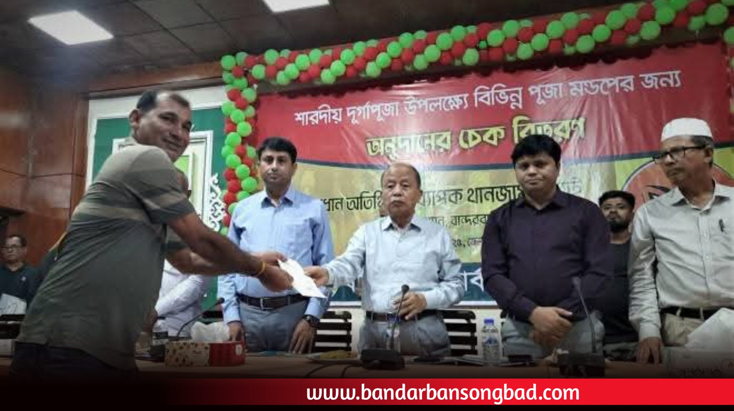 সনাতন ধর্মাবলম্বীদের অন্যতম ও সর্ববৃহৎ ধর্মীয় ও সাংস্কৃতিক উৎসব শারদীয় দুর্গোৎসব উপলক্ষে বান্দরবানে পার্বত্য জেলা পরিষদের উদ্যোগে দূর্গা পূজা উৎসব উদযাপন পরিষদের মাঝে অনুদানের চেক ও নগদ অর্থ উপহার প্রদান করা হয়েছে।