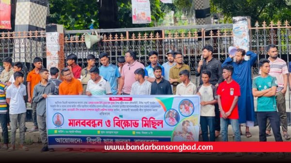 ডাকসুর সাবেক ভিপি নুরের উপর হামলা ও আওয়ামী নেতার জামিনের প্রতিবাদে বান্দরবানে মানববন্ধন ও বিক্ষোভ